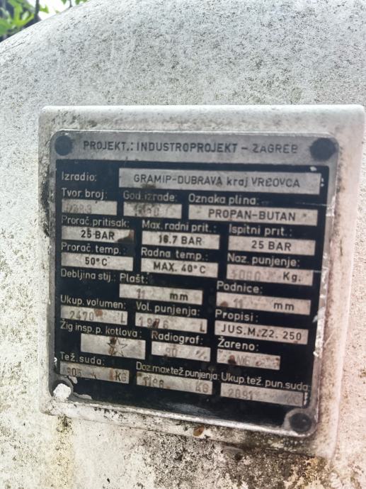 Besplatno dajem propan butan cisternu od 2470l iz 1980. godine. Nalazi se iza kuće gdje nije moguće pristupiti vozilom. Potrebno je samostalno organizira prijevoz i utovar iste.