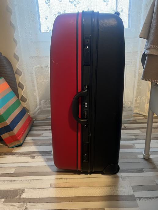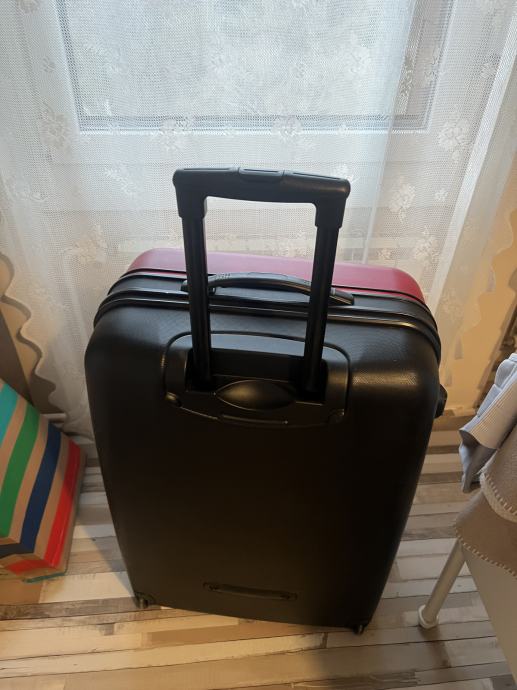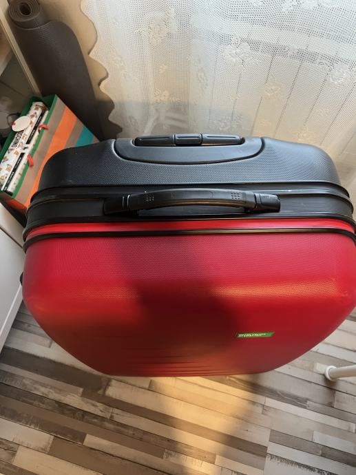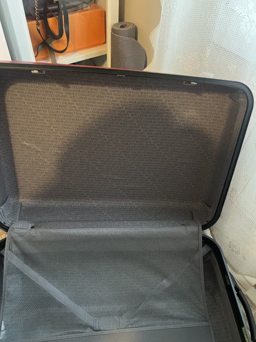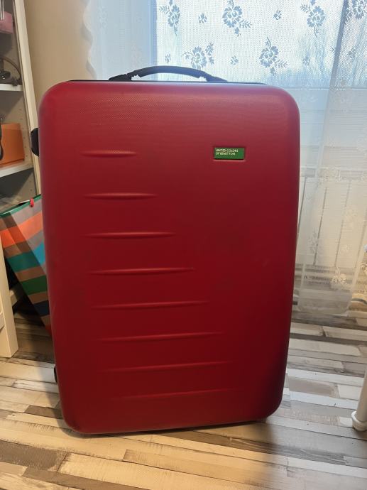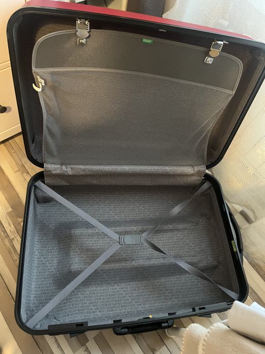 Kofer je najveci koji imaju u ponudi u Benettonu. Koristen je 3 puta za daleka putovanje. Iznutra je čist, uredan i praktički nov. Izvana ima nekoliko crtica od aerodroma. Tko putuje avionom zna kako to ide… dimenzije kofera visina 74cm, širina 50 cm i dubina 30 cm. Stane jako puno u njega…