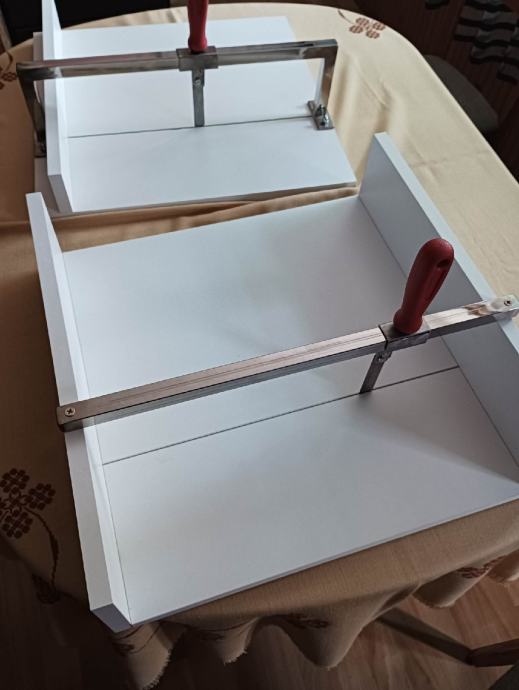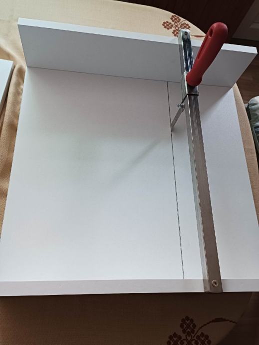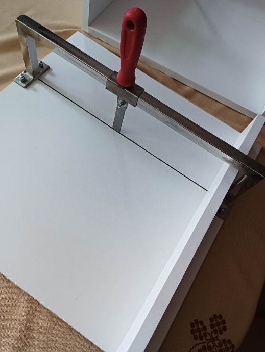 Rezač za kolače izrađen od inox na ploči od iverala,oštrica od skalpela koju je moguće zamjeniti,za precizno rezanje kolača na odgovarajuće dimenzije.