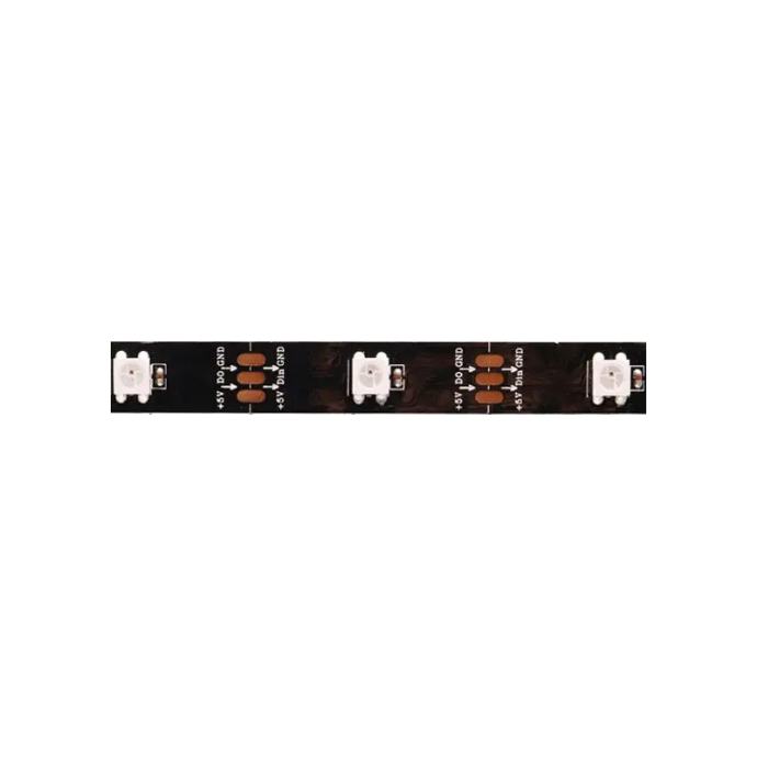 LED traka duljine 1 metar s 30 WS2812B RGB LEDica (poznate i kao NeoPixel) koje je moguće pojedinačno kontrolirati - ovo je digitalna traka s adresiranjem svake pojedine LEDice čija boja se kontrolira s 8-bitnom PWM preciznošću (24-bitna boja). Traka je napravljena od crnog fleksibilnog PCB materijala bez dodatne zaštite (nije za vanjsku upotrebu). Prodaja po metru, maksimalno 5 m u komadu.