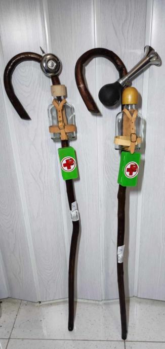 drveni štapovi sa zvoncem ili trubom,staklenom bočicom i kutijicom prve pomoći(vidi sliku)..visina štapa 90cm