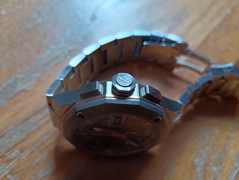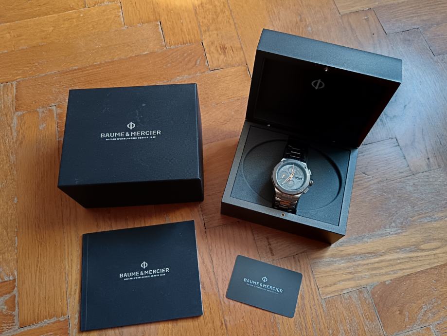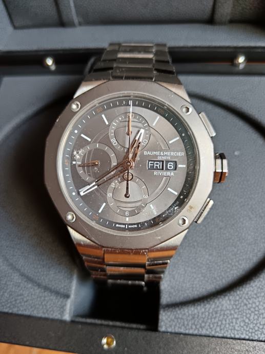 Prodajem luksuzan sportski sat, čuvenog švicarskog proizvođača „Baume & Mercier“, model 'RIVIERA 10750' napravljen za 50 godišnjicu proizvodnje linije 'Riviera', sa automatik samonavijajućim mehanizmom, krono, sa prikazom datuma i dana u tjednu. Veličina kućišta 43 mm.
