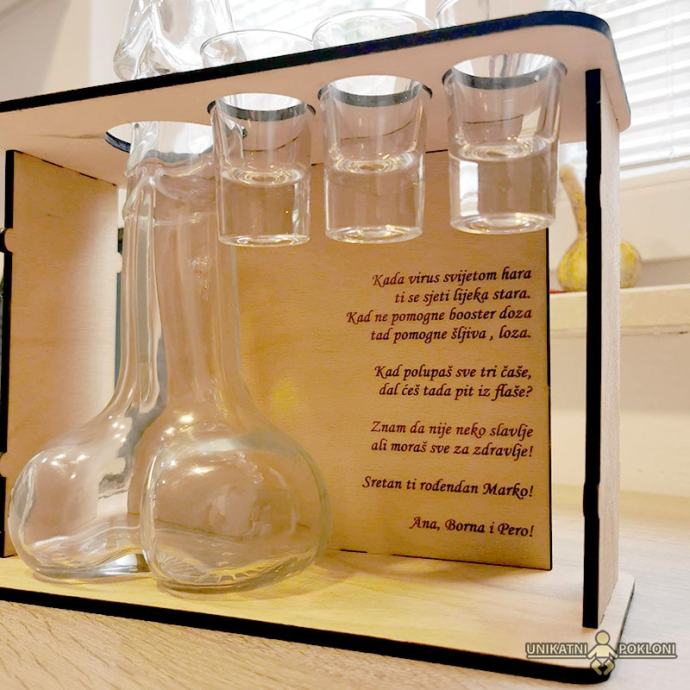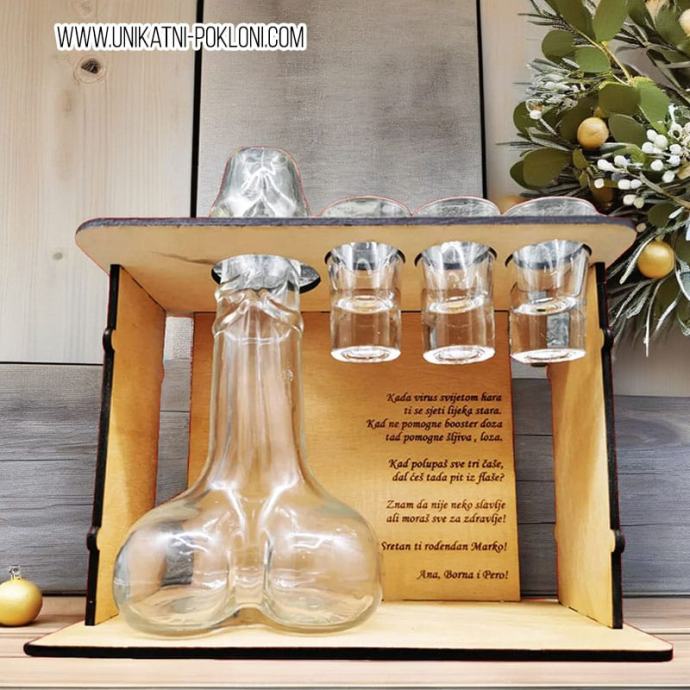 Boca specifičnog oblika – jer zašto bi sve u životu bilo ozbiljno? Ova jedinstvena boca sama po sebi je prava atrakcija, ali kad je napunite šljivom ili lozom, postaje glavni “lijek” večeri.