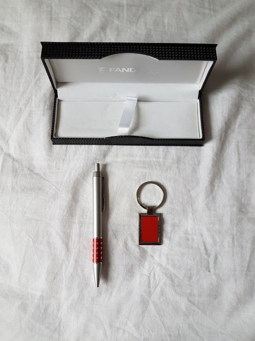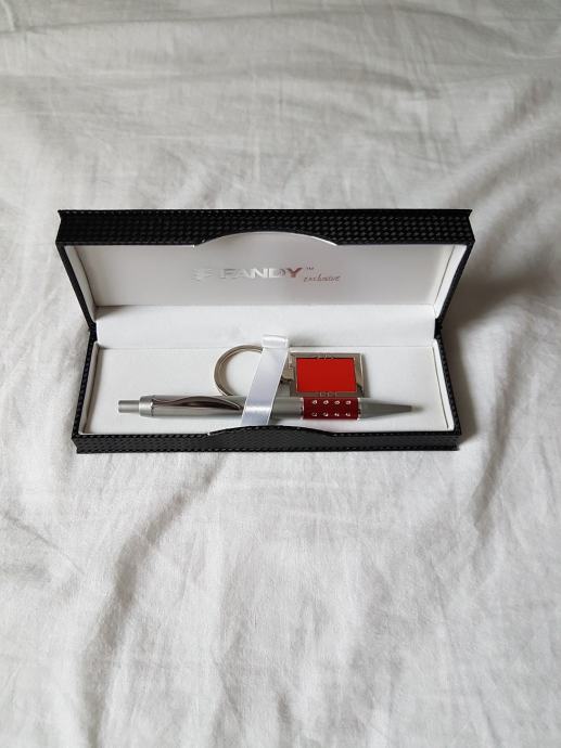 Novi i nikada korišten set kemijske olovke i privjeska za ključeve srebrno crvene boje. Dolaze u pripadajućoj kutijici (etui). Odlično kao poklon.