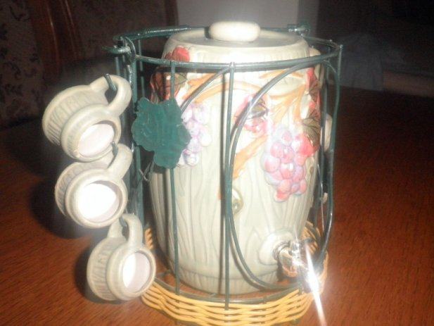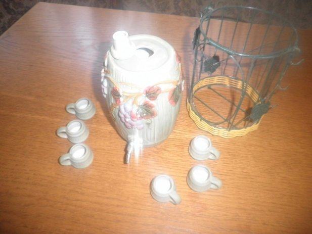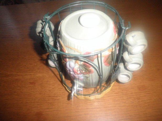 Set sa šest čašica za žešću sve u opletenoj željeznoj mrežici sa ručkom za vješanje, sa prekrasnom reljefno ukrašenom bocom ...... prekrasan uporabni ali i kao dekorativni predmet za svaku bolju konobu, tarasu, vikendicu, splav, sjenicu ili dnevni boravak.