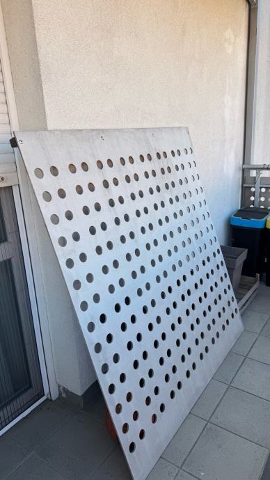 Prodajem sjenilo za balkon. Radi se o većoj ploči s perforacijama koje propuštaju dio svjetlosti, a istovremeno osiguravaju privatnost i zaštitu od sunca. Materijal je od tvrde plastike, svjetlosive boje.