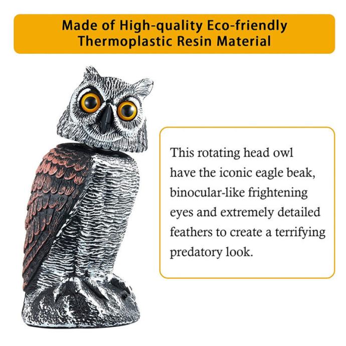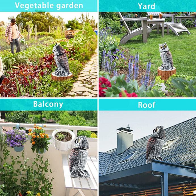 Sova strašilo se jednostavno postavlja na podlogu s obzirom da ima svoje postolje. Sova strašilo je izrađena od otporne plastike i može se koristiti u svim vremenskim uvjetima.