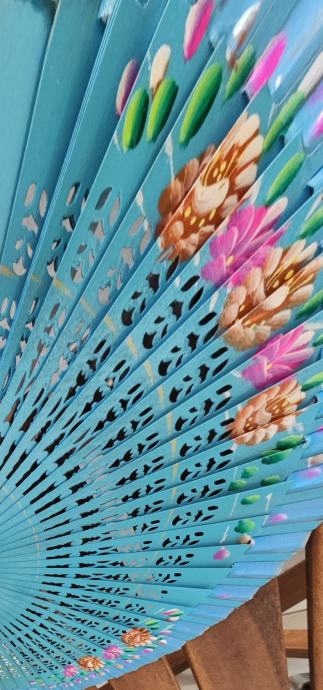 sklopiva drvena LEPEZA, plava sa cvjetnim motivima