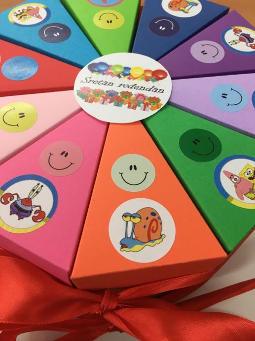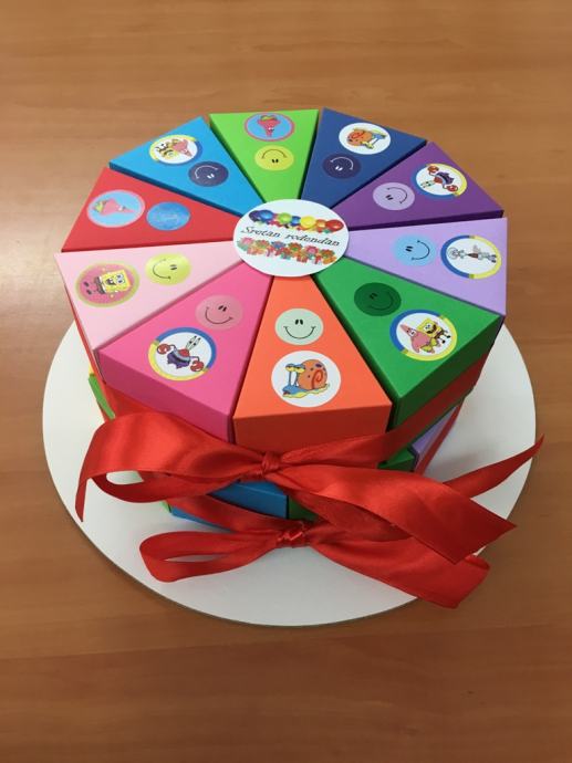 Samosložive kutijice (nema ljepljenja) u obliku kriške torte izrađene od 250 gramskog hamer papira u 14 boja koje birate po želji (zadnja slika u galeriji).