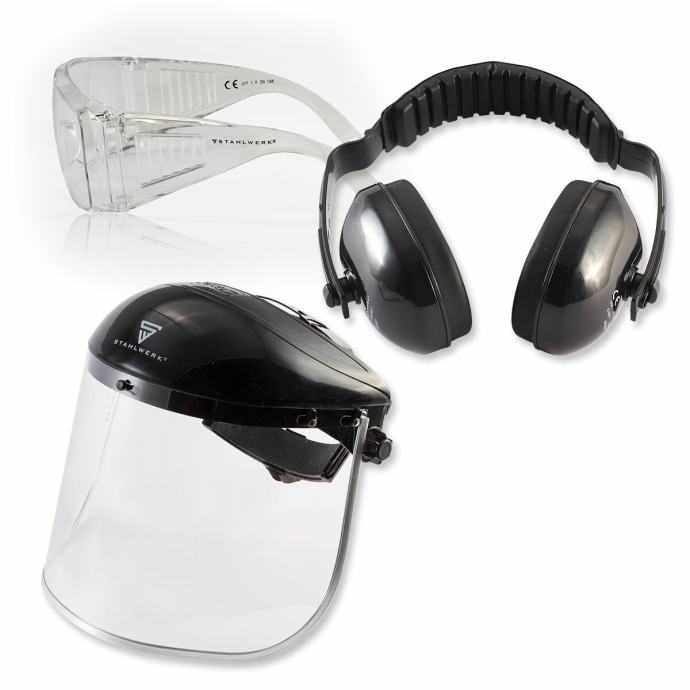 Sigurnosni set STAHLWERK AS-1 sadrži sve korisne predmete za zaštitu lica i sluha. Opseg isporuke uključuje štitnik za lice, štitnike za uši i zaštitne naočale s površinom otpornom na ogrebotine. Zahvaljujući offset sljepoočnicama, zaštitne se naočale mogu nositi i kao naočale. Sva tri predmeta mogu se nositi u kombinaciji kako bi se osigurala sveobuhvatna zaštita očiju i ušiju na radu te zadovoljila klasifikaciju OZO prema (EU) 2016/25.
