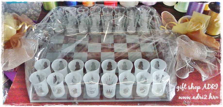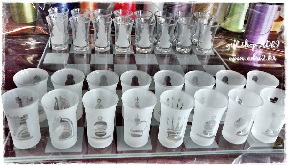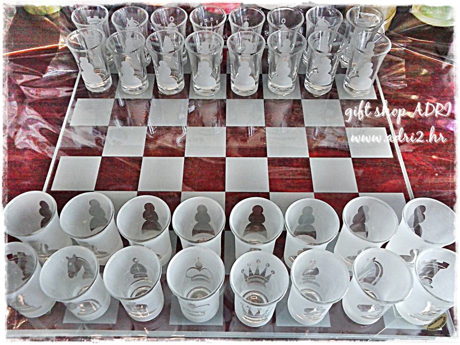 Mi imamo u ponudi stakleni šah sa čašicama za rakiju....šahovska ploča izrađena je na ogledalu....