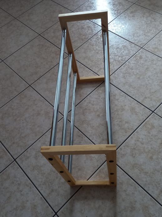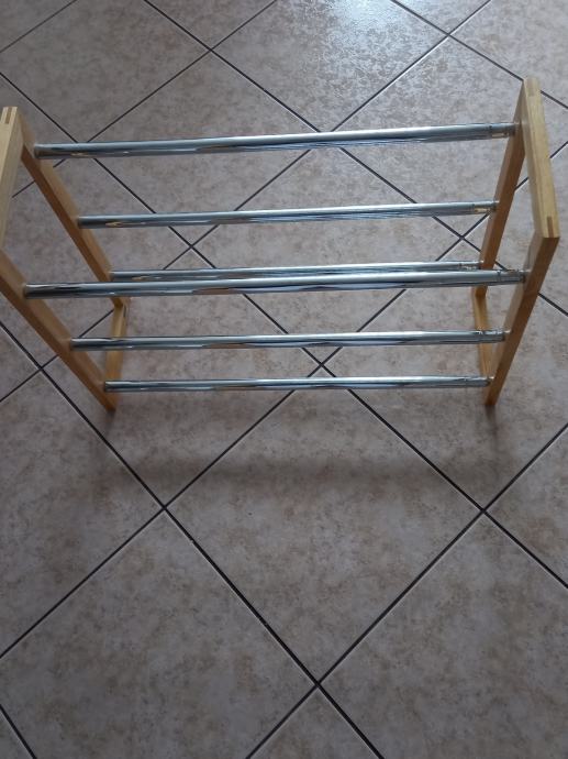 Prodajem novi stalak za obuću s drvenim bočnim nosačima svjetle boje i metalnim kromiranim šipkama. Dužina 60 cm i može se razvući ( produžiti) do 118 cm. Visina 46 cm, a širina 22 cm. Stalak ima tri razine i može se proširiti, što ga čini prilagodljivim različitim prostorima. Konstrukcija je stabilna i čvrsta.