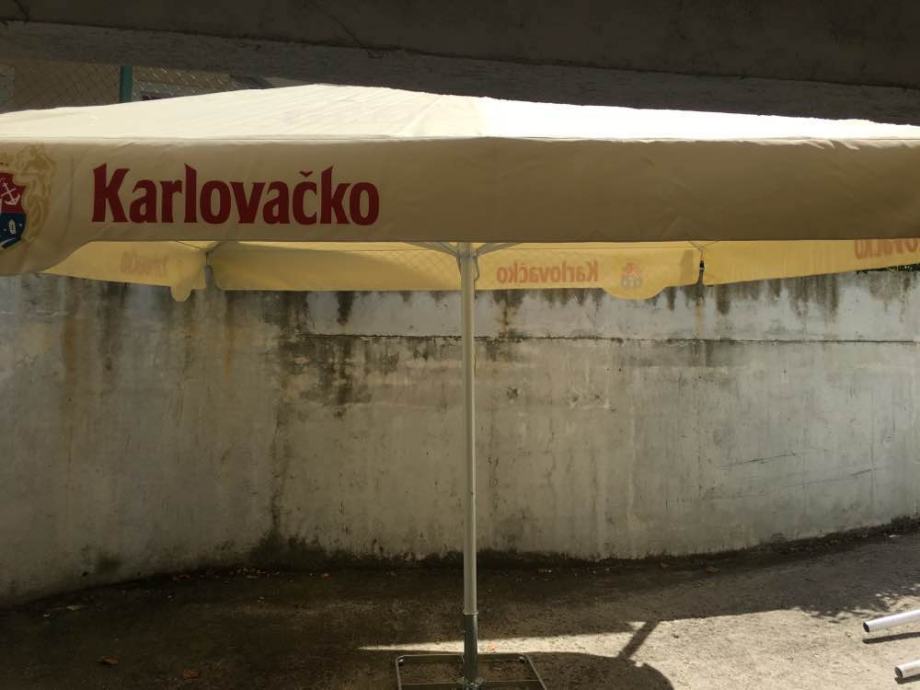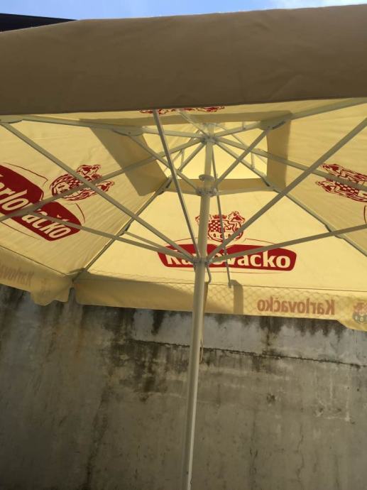 PRODAJEM NOVI veliki ugostiteljski suncobran sa krovićem na vrhu protiv vjetra. Aluminijska konstrukcija. Veličine 3.5x3.5m.
