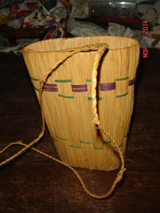 suvenir - pletena košarica ( slama ili sl. ) ovalnog oblika visine 14 cm sa remenom od lika