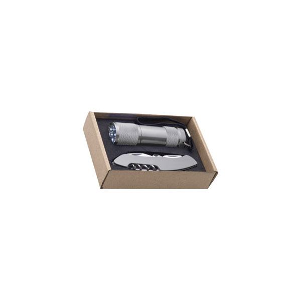 Poklon set koji se sastoji od aluminijske ručne svjetiljke sa 9 led lampica i višenamjenskog noža izrađenog od inox-a. Dužina svjetiljke: 8.5 cm, promjer: 2.5 cm. Svjetiljka dolazi zajedno sa baterijskim ulošcima. Višenamjenski nož ima 11 različitih funkcija, dimenzije noža: 10x2.5x1.5 cm. Set dolazi u jednostavnoj kartonskoj poklon kutiji. Dimenzije poklon kutije: 9x13.5x3 cm.