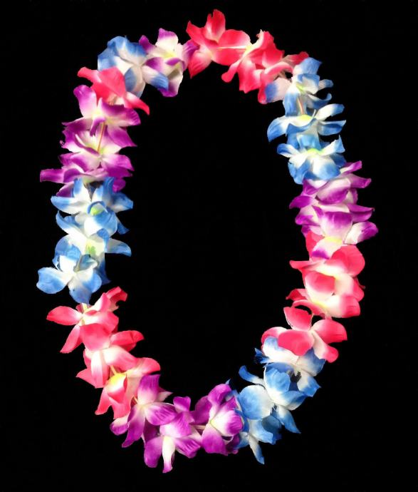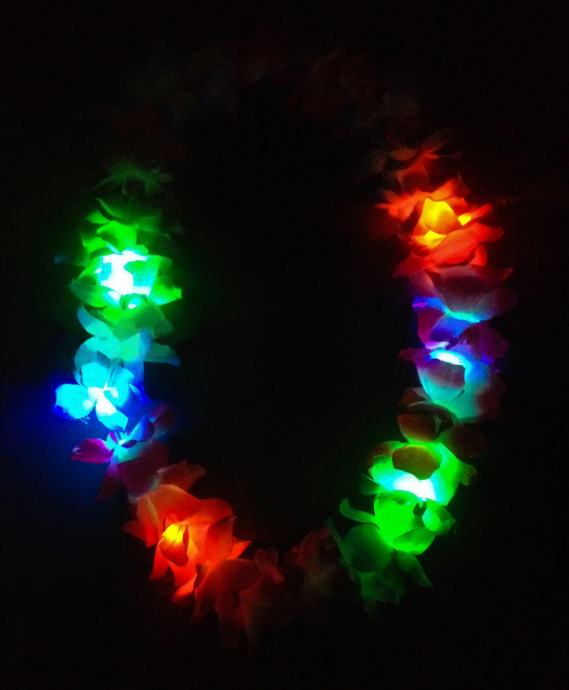 Svjetleće hawaii ogrlice iste kao na slici (šareni cvjetovi) ima mogućnost da svjetli kada želite jer ima podesivač on i off a radi na baterije.