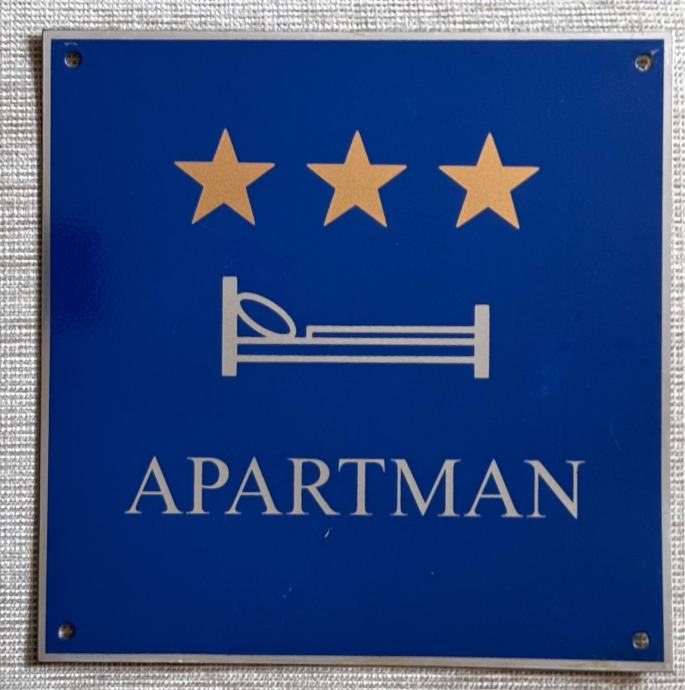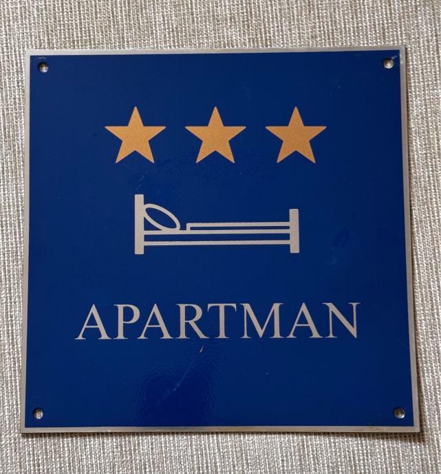 Tabla Apartman s 3 zvjezdice, rabljeno, očuvano, mala ogrebotina na dnu. Izrađeno u firmi “Kordun”.