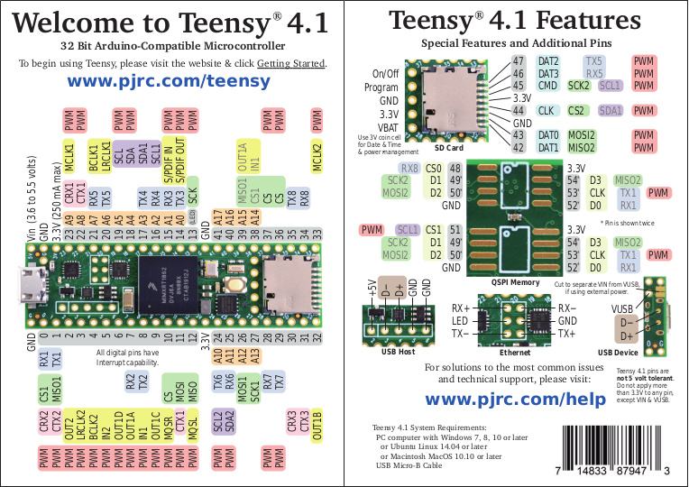 Najnoviji i najopremljeniji Teensy u verziji 4.1 baziran je na 600 MHz ARM Cortex-M7 procesoru, ima 4x više flash memorije (8 MB) od Teensya 4.0, kao i mogućnost dodavanja još dva memorijska čipa, 55 I/O pinova, ethernet PHY čip, čitač microSD kartica i USB host port. Dimenzije su identične Teensyu 3.6 (61x18 mm), pločica dolazi bez headera.