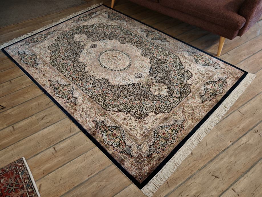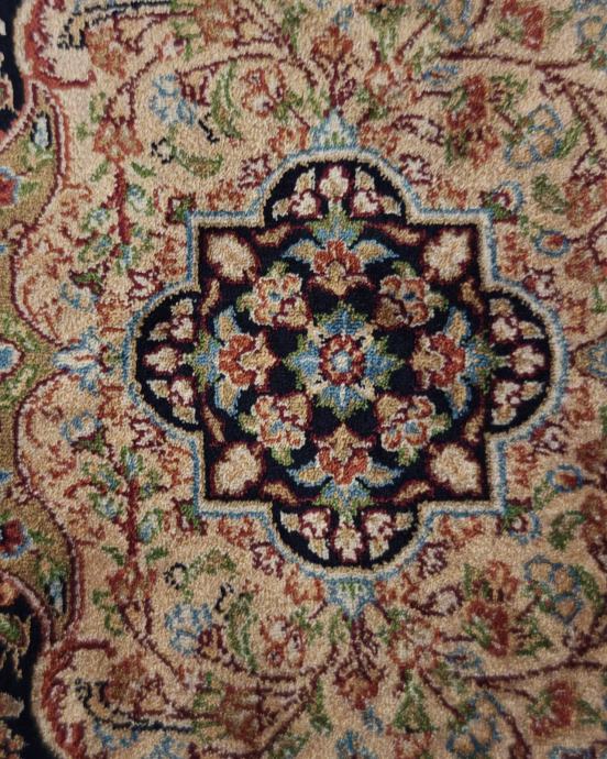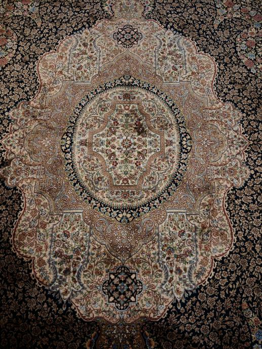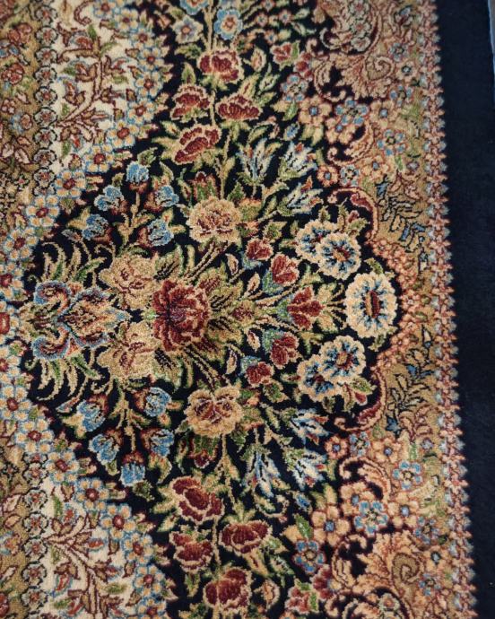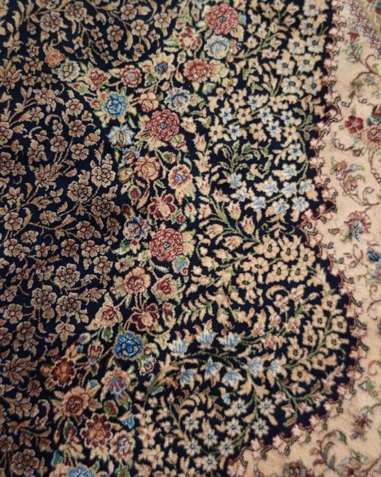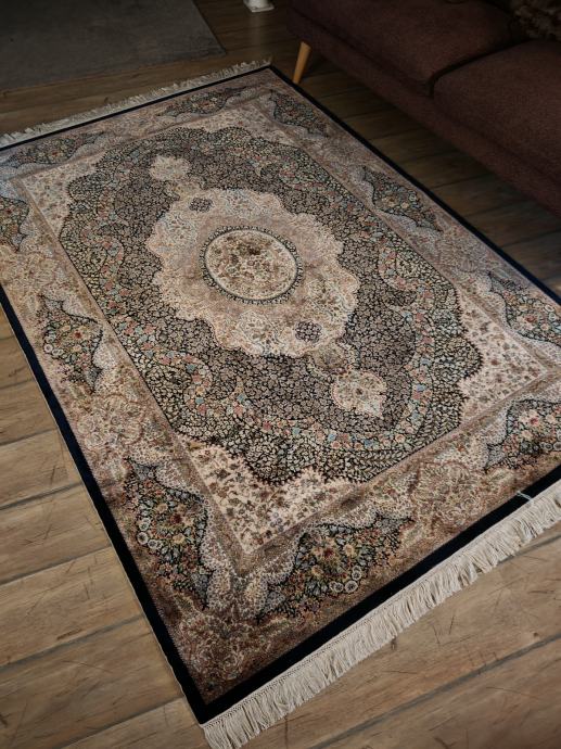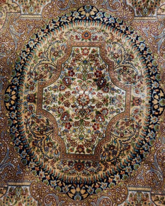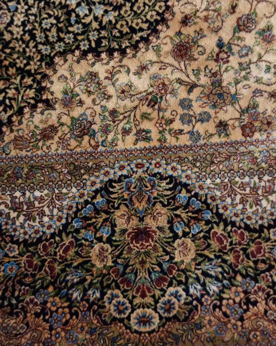 Ovaj predivni tepih od svile ručno je tkan u Indiji i oblikovan po uzoru na tradicionalne perzijske tepihe. Orijentalni uzorci u tepihu sastoje se djelomično od medaljona i ponavljajućih uzoraka, ali s tipičnim vrtnim motivom. Tepih je jako visoke kvalitete i zahvaljujući izboru svilenog materijala, tanak je i lagan sa prekrasnim blistavim sjajem. Korištenje svile omogućuje izradu detaljnih uzoraka i preciznost njihove izrade je impresivna.Dimenzije 225x 155 cm.