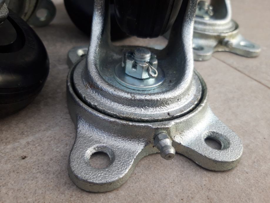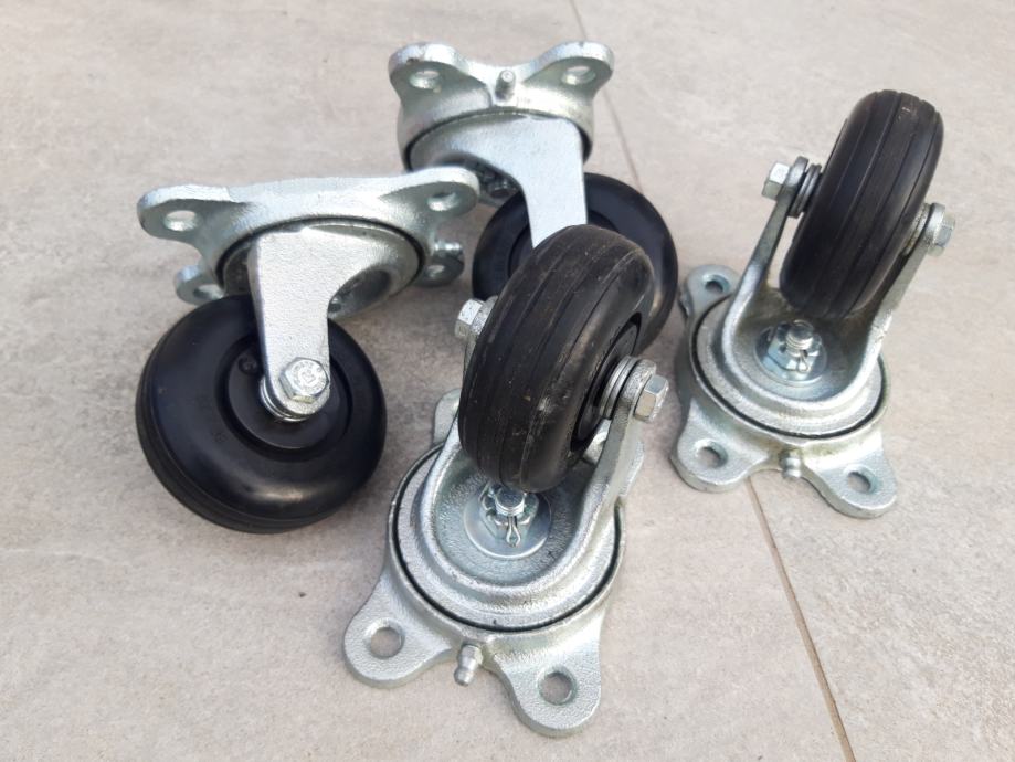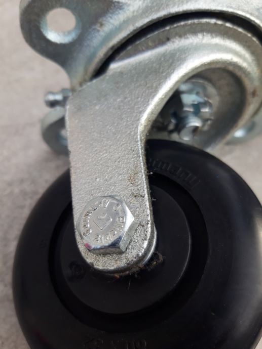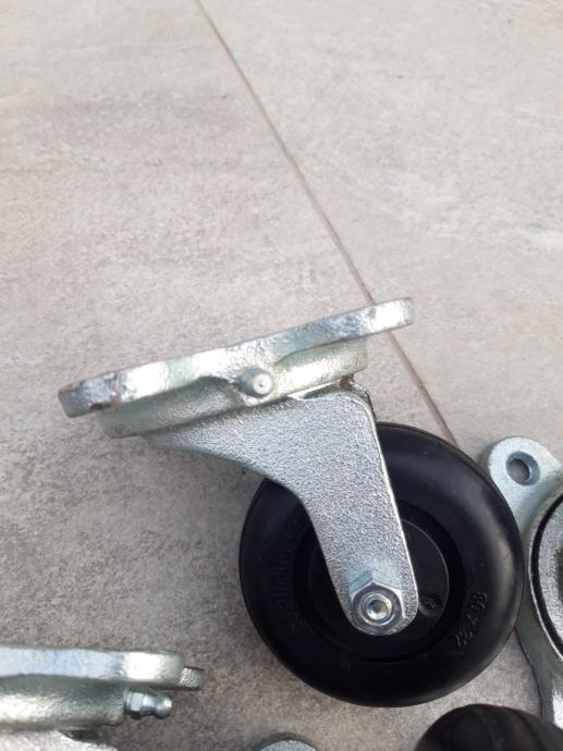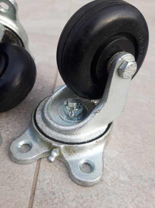 Industrijski teretni kotači BLICKLE GERMANY 80X32. Kotači imaju mazalice za podmazivanje. Izuzetno čvrsto tijelo od lijevanog čelika. Jedan kotač ima 1,5 kg. Jedan kotač nosi do 340 kg. Jedan u dućanu košta 65 eura. Prodajem ih sva 4 za 60 eura. Mob 091444 4281