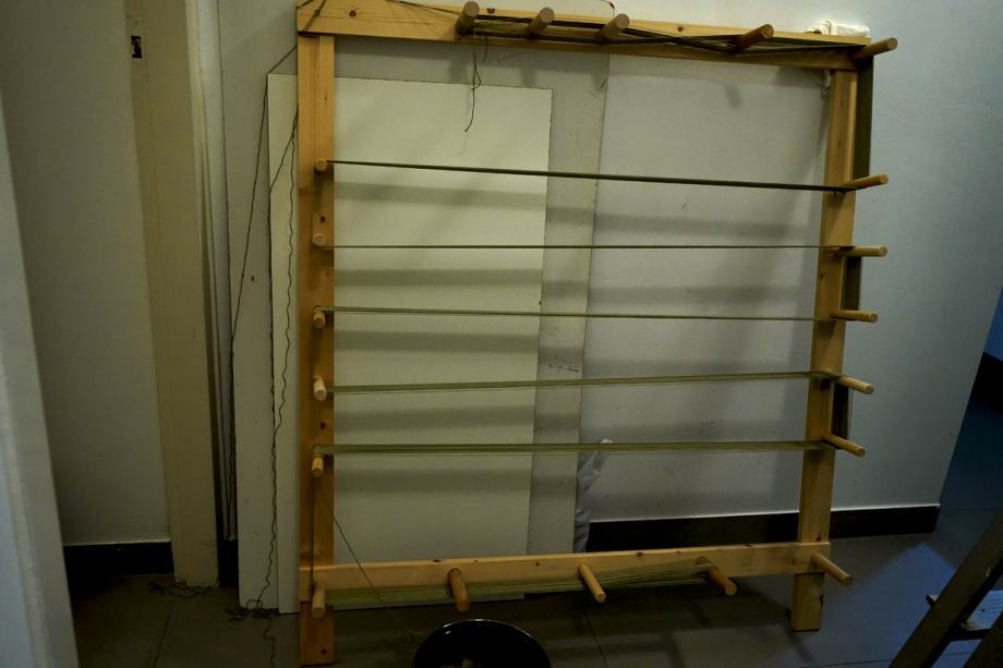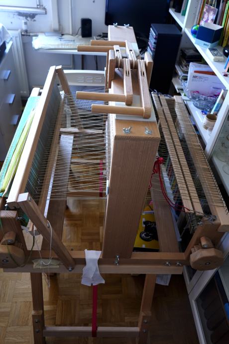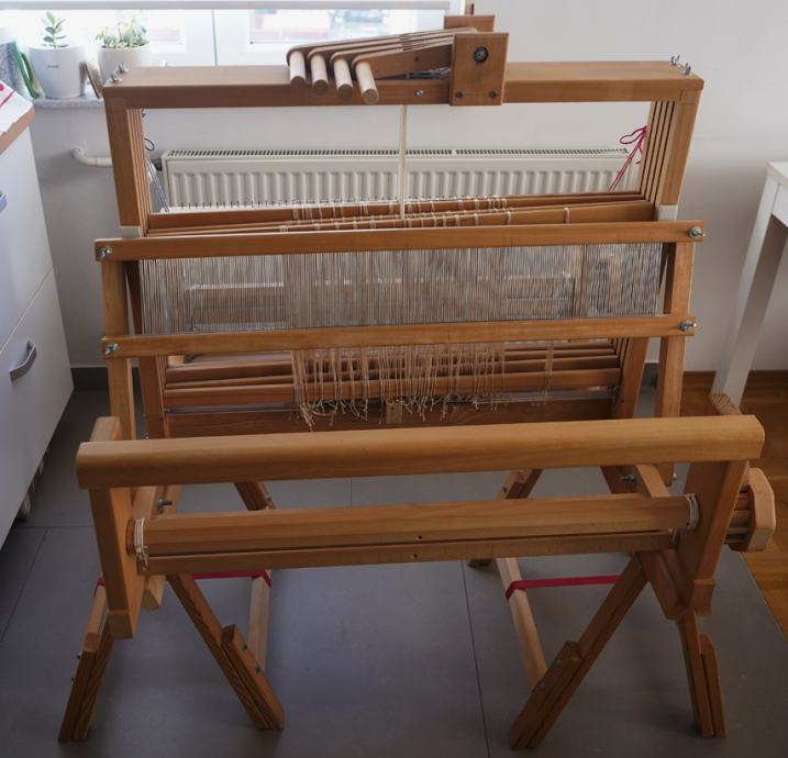 Tkalački stan, ručno i precizno izrađen prema vlastitom projektu. Materijal je parena bukovina. Mogućnost tkanja do širine 82 cm. u kompletu su još nogari za stan, motalica, čunkovi i igla za lako provlačenje osnove.Gabariti su približno 95x95x80 cm. Stan je vrlo malo korišten i praktično je nov. Ugrađeni su utori za vođenje nićenica kao i opruge za njihovo pridržavanje u vodoravnom položaju.
