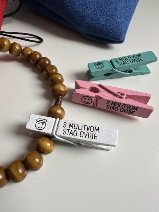 Uz torbicu se dobiju 2 štipaljke s natpisom "S MOLITVOM STAO OVDJE".