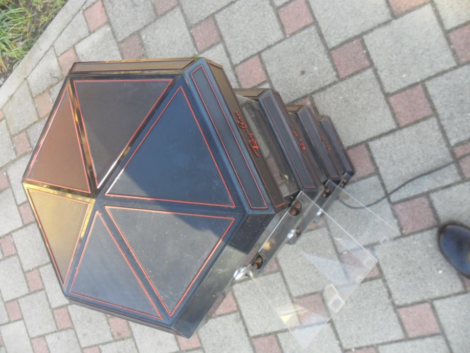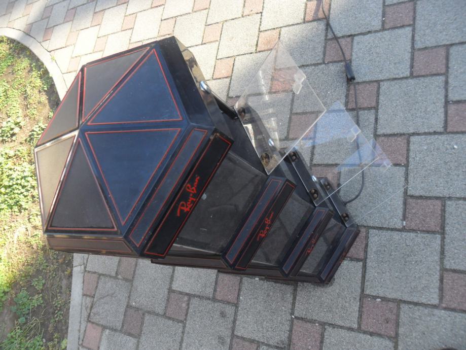 nekad u njoj bile naočale,zatvorena,gdje svaki dio ima vratašca,i svjetlost,materijal profi plastika(okvir) i pleksiglas kao bočna stakla,,možete ju koristiti za svašta..visina 85cm,promjer 40cm..ovaj komplet može biti stoječi i viseči na zidu i nema nikaklovih oštečenja jedino potrebno malo oprati