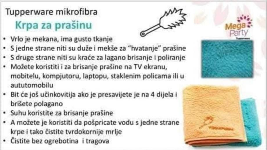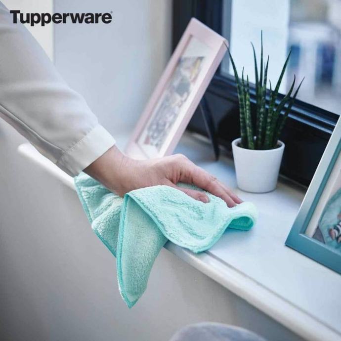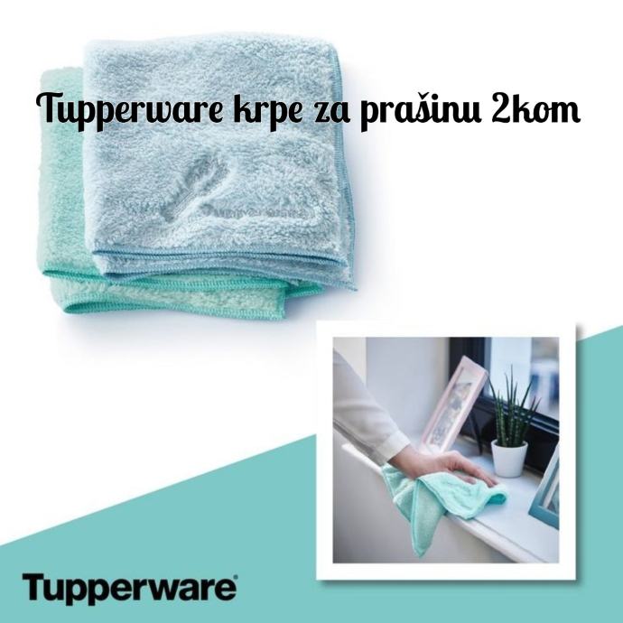 U setu su dvije Tupperware krpe za prašinu. Izuzetno mekano vlakno te se koriste za suho i mokro brisanje. Osim prašine možete s njima brisati sve površine i namještaj. Peru se na 60 stupnjeva bez upotrebe omekšivača.