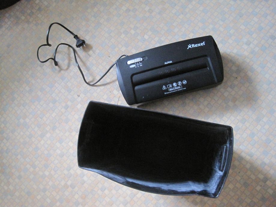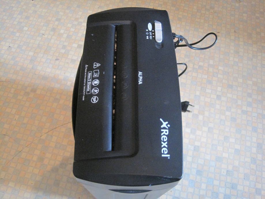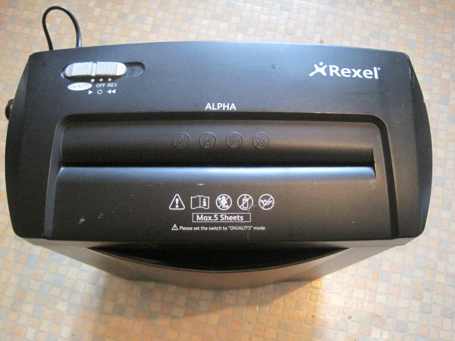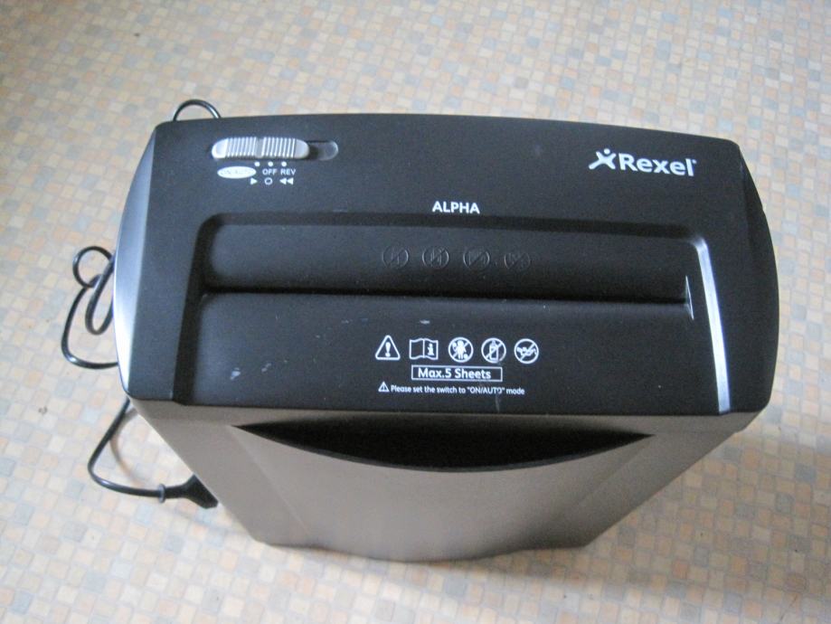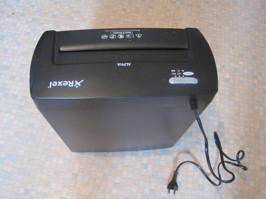 Uređaj je korišten ali je u jako dobrom stanju .Širina rezanih dokumenata je 220 mm (max ) .Osim papira uništava spajalice ( ručne i strojne ) i kreditne kartice .