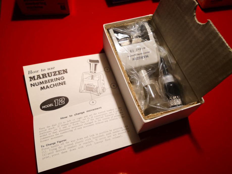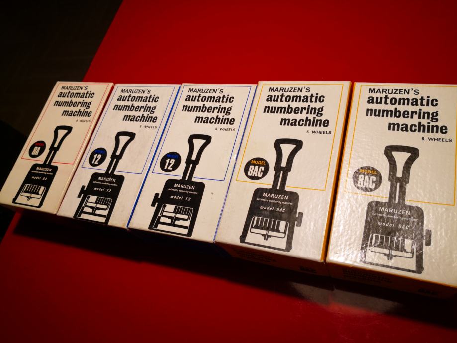 Potpuno novi i nekorišteni Maruzen uredski brojači u kutijama, s pratećim papirom i bočicom za tintu. Stanje tinte - nepoznato, možda je i nema. Na raspolaganju jedan komad oznake Model 8AC, jedan komad Model 12, jedan komad Model 8A. Cijena 100 kn po komadu.
