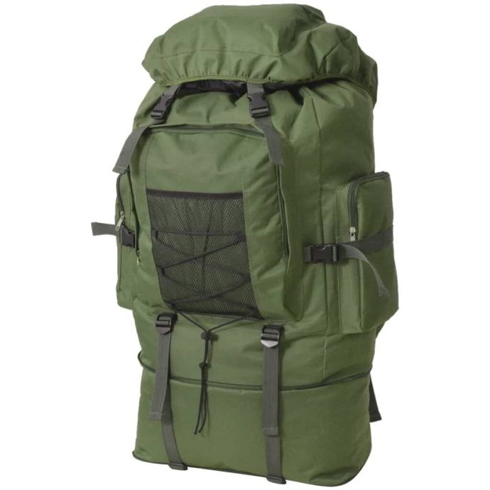 Izrađen od visokokvalitetnog obloženog 600D poliestera,ovaj ruksak je izdržljiv i vodootporan. Ruksak u vojnom stilu ima dvije široke naramenice i podesivi remen za struk sa kopčom za zatvaranje. Ima veliki kapacitet od 100 litara, tako da možete spakirati sve što je potrebno za putujuću avanturu. Veliki glavni pretinac možete koristiti za spremanje velikih stvari, a vrpca za stezanje i zatvarač sa kopčom jamče da svoje stvari čuvate na sigurnom.Tu je prednji džep sa ciferšlusom, jedan džep sa mrežom, dva bočna džepa sa ciferšlusom i dva džepa sa ciferšlusom i poklopcem, koji pružaju dodatni prostor za sigurno i praktično pohranjivanje potrebnih predmeta kao što su noževi, naočale i svjetiljke.
