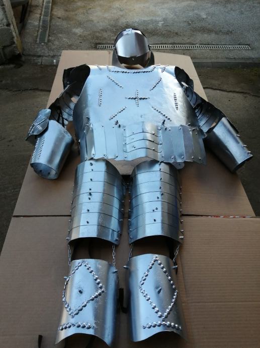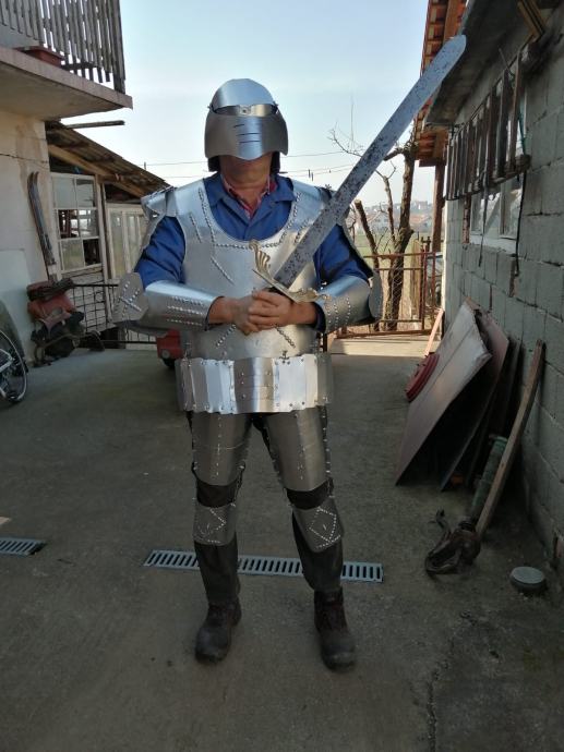 Imitacija viteskog oklopa sa mačem i kacigom. Na sebe moze staviti čovjek od 100kg težine i 190cm visine. Cijena 200e