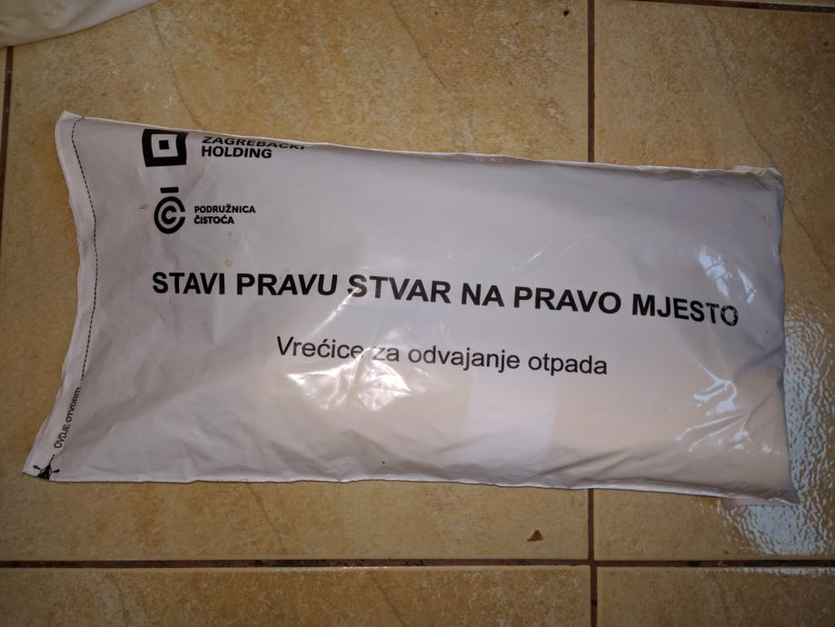 Vrećice za odvajanje otpada zagrebačkog holdinga. Unutra se nalazi paket vrećica za plastiku/metal i paket vrećica za biootpad