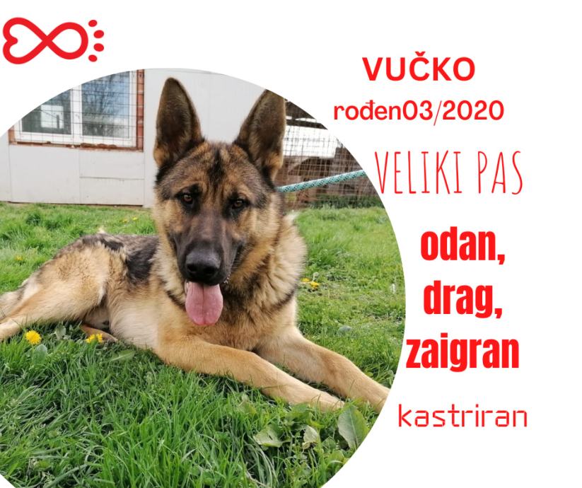Vučko je veseli, razigrani i vjerni pas, kao što njemački ovčari i jesu. Rođen je u ožujku 2020. godine. Osobi koja ga odluči udomiti bit će pravi pratitelj i prijatelj.