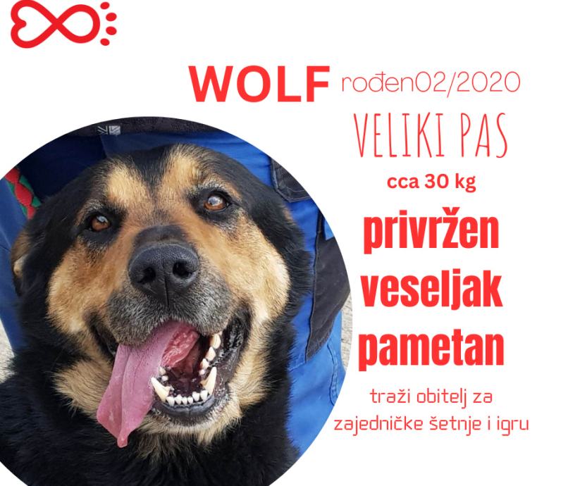 Wolf je veliki dečko od cca 30 kg, rođen u veljači 2020., koji je nađen kako luta uz zagorsku magistralu. Nitko se za njega nije javio i on traži svoju novu obitelj. Jako je veseli i privržen. Wolf bi se brzo prilagodio novim uvjetima jer je jako zahvalan i pametan. Kod nas je očišćen od parazita, čipiran, kastriran i cijepljen te spremno čeka da njegovi ljudi stignu po njega.