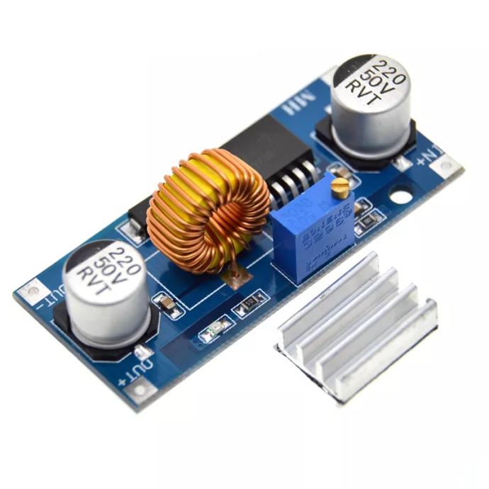Step down modul baziran na XL4015 čipu, ulaz 4-38 V, izlaz 1.25-36 V, do 5A (preporučljivo do 4.5A), maksimalno 75W (za više od 50W koristite priloženi pasivni hladnjak), radna frekvencija 180 KHz, efikasnost do 96%, zaštita od kratkog spoja i pregrijavanja, dimenzije 54x23x18 mm.