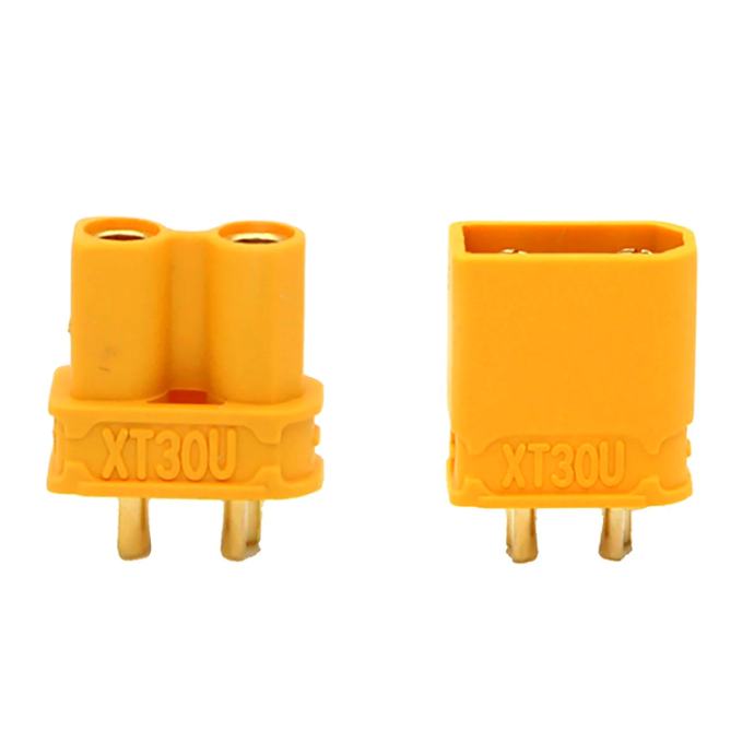 Muški i ženski XT30U konektor, izrađen od temperaturno izdržljivog najlona, s pozlaćenim konektorima i oblikom koji sprečava krivo spajanje. Pruža izuzetno čvrsti kontakt koji može podnijeti do 15A kontinuiranog opterećenja (strujni udar do 30A).