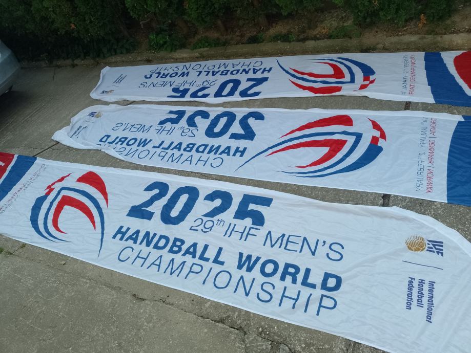 Po komadu. Tri komada. Sa svjetskog rukometnog prvenstva 2025. Platno/poliester. 430 cm x 80 cm. Na krajevima su zaobljene. Dobre kao paravan od znatiželjnih pogleda susjeda. Nisu prečiste ali ni zamazane,malo ih treba osvježiti.