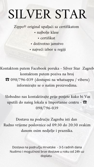❗️❗️❗️ Važna obavijest: na tržištu postoje različite imitacije Zippo upaljača, upitne kvalitete i dugotrajnosti, savjetujemo Vam da kupujete upaljače isključivo u poslovnicama Silver Star - Importanne centar lokal 93 ( mapa centra u slikama) ili Tržnica Kvatrić - Pavla Šubića 42 ili jednostavno narucite telefonski (whatsapp VIBER ) - 098/796-039