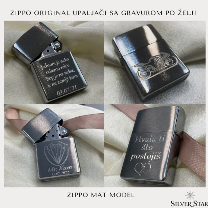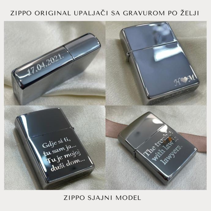 Široki asortiman Zippo upaljača orignal sa doživotnom garancijom. Zippo upaljači su vjetrootporni upaljači klasičnog i prepoznatljivog dizajna uz kojeg ce te sigurno biti primjećeni. Upaljač sa doživotnom garancijom!! Cijena upaljača je ovisna o modelu i složenosti gravure.