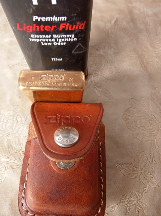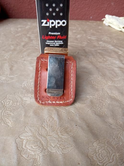 Original zippo upaljač kupljen u Siriji u kampu UN mirovnih snaga, uz njega torbica i benzin. Na svemu piše MADE IN USA