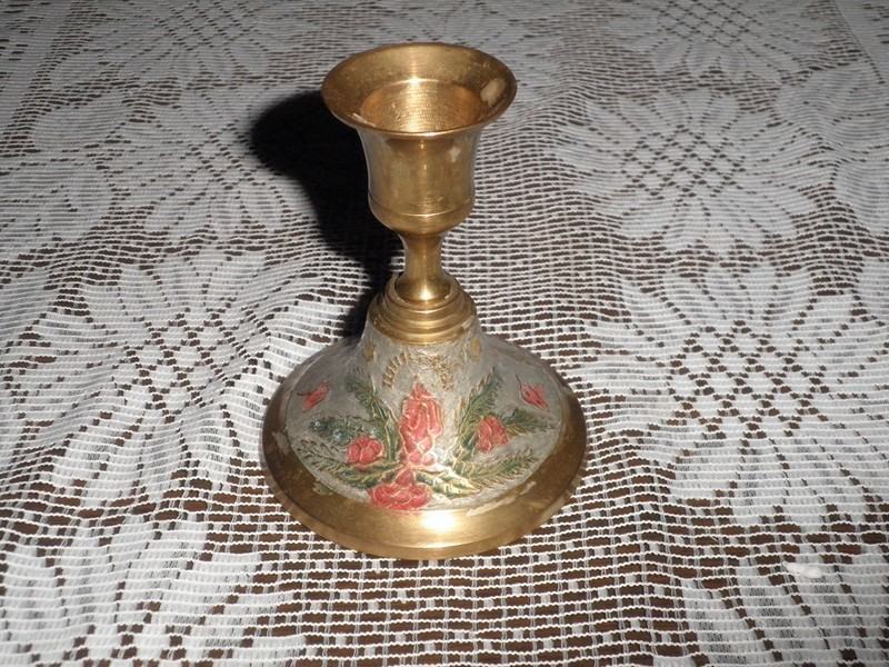 Prekrasan stari svijećnjak od mesinga, reljefno obrađen i u boji oslikan sa cvijećem...