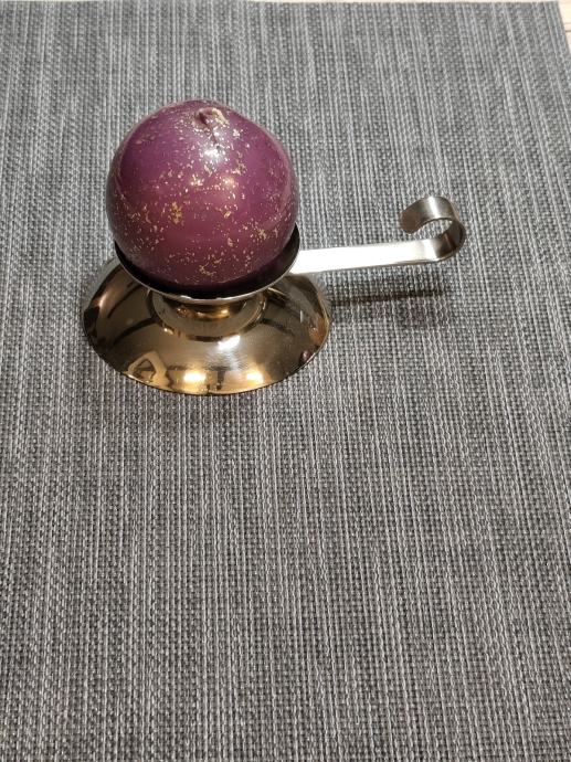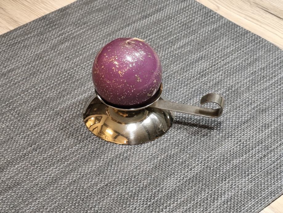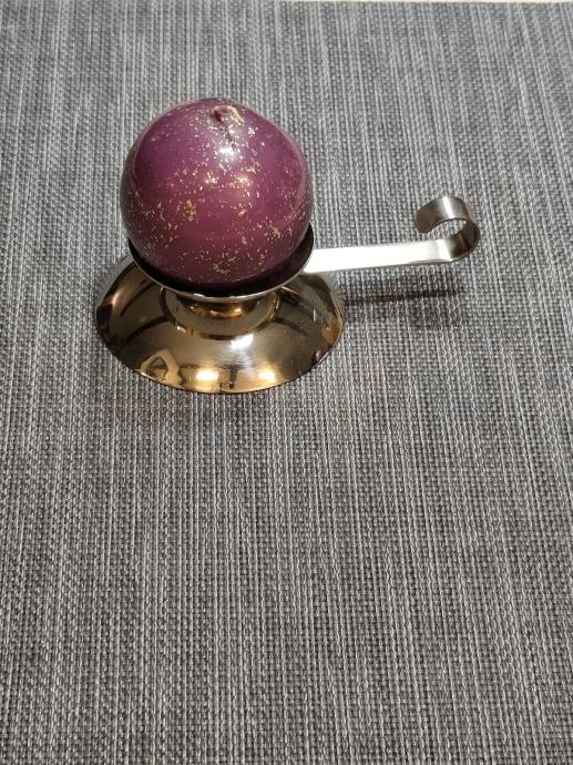 Svijećnjak sa ukrasnom svijećom koja na sebi ima srebrne šljokice.