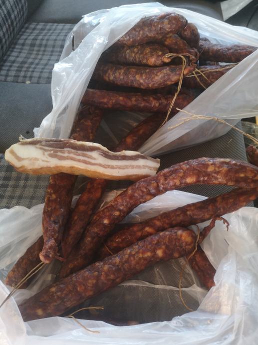 Prodajem domaće pršute i plećke kobasice pancete I klasa od svinja iz vlastitog uzgoja. cijena pršuta je 20eur/kg a plećke 15eur/kg. Cijena kobasica 13eur panceta 15eur kg ima panceta od 2 prsta debljine i od 4 prsta garancija na robu ako nije u redu vratite taj dobijete novi