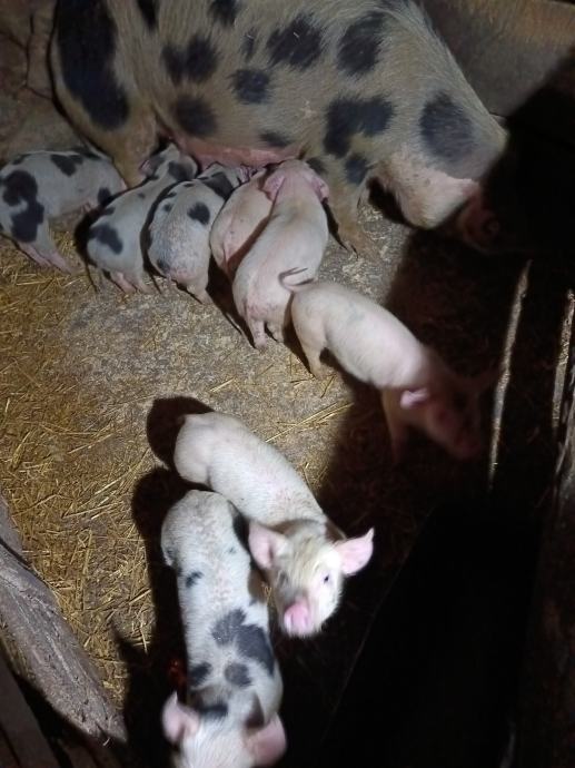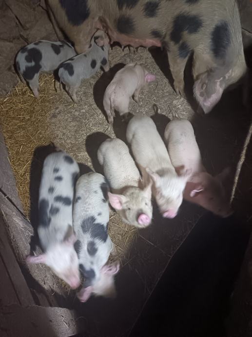 Odojci odbijanci 10 kom, vlastiti uzgoj na gospodarstvu ,9 muški i 1 žensko nisu škopljeni još, vrhunska sorta banijska šara njemački landras dugački, jedu svu hranu odlično, 2 mj stari , za tov ili božićne i novogodišnje blagdane vrhunski, prodajem u kompletu svih 10 za 1200 eura, može i na odabir 130 eura pa birate, nisam vagao i ne važem male odojke , može sa papirima može bez meni svejedno, molim samo ozbiljne pozive bez zamjena i filozofiranja, Krnjak!!