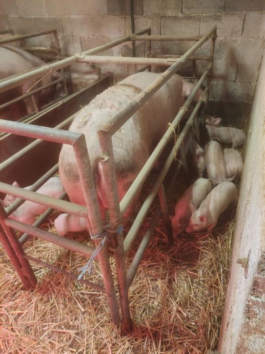 Prodaje se 12 odojaka landras×yokšir, stari pet tjedana 8 muških i 4 ženska,muški su kastrirani cjena 1000 e komplet, moguče zamjene za muško tele za tov