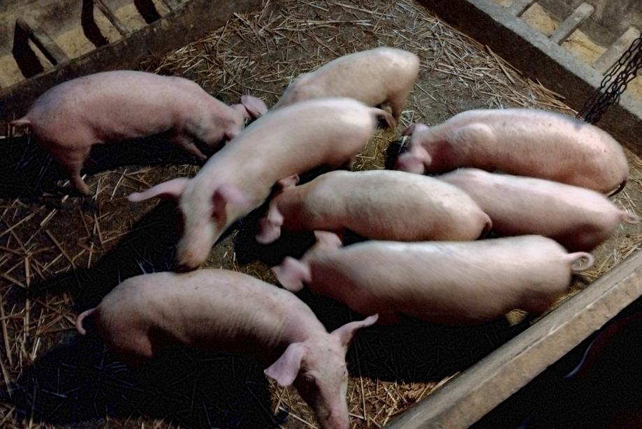 Odojci 14 komada, 4 m, 10 ž ( muški nisu kastrirani). Mix landras-durok. Težine od 18 do 33 kg.