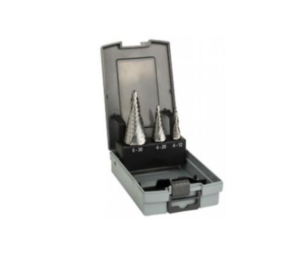 Tekst proizvoda, pribor sivi 3-dijelni set stupnjevitih svrdla
