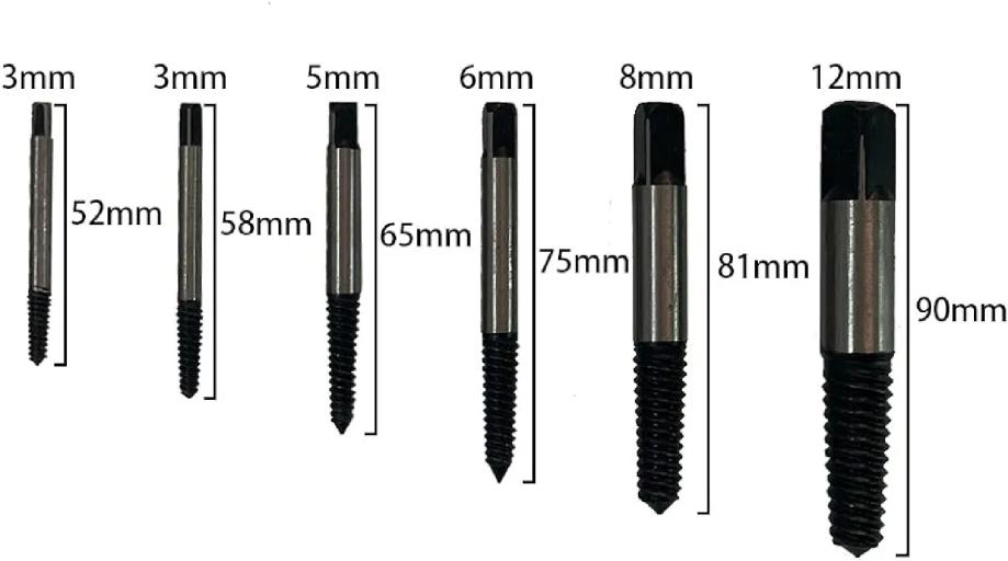 Paket uključuje: 6 x vijaka za izvlačenje; 6 x svrdla. Svrdla uključuju: 4 mm, 4,5 mm, 6,5 mm, 7,5 mm, 11 mm, 15 mm; Vijčani ekstraktor uključuje: 4-6 mm, 6-8 mm, 8-11 mm, 11-14 mm, 14-18 mm, 18-22 mm