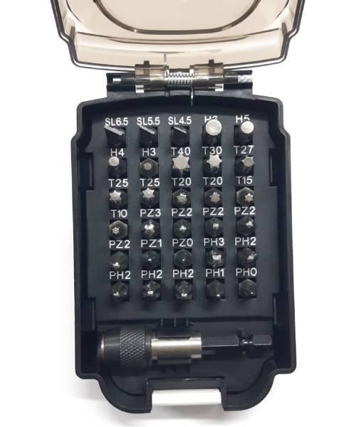 25 mm: PH0, PH1, PH2, PH3, PZ0, PZ1, PZ2, PZ3, SL0,6×4,5, SL0,8×5,5, SL1,2×6,5, T10, T15, T20, T25, T27, T30, T40, HEX3, HEX4, HEX5, HEX6, Držač nastavaka za steznu glavu